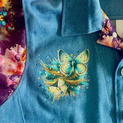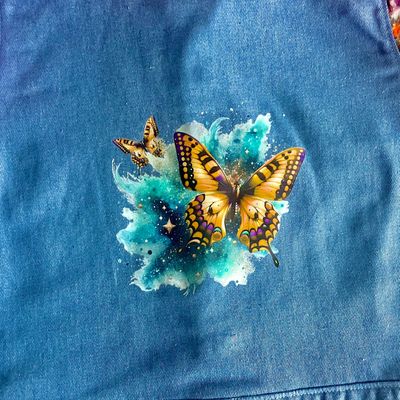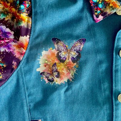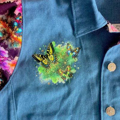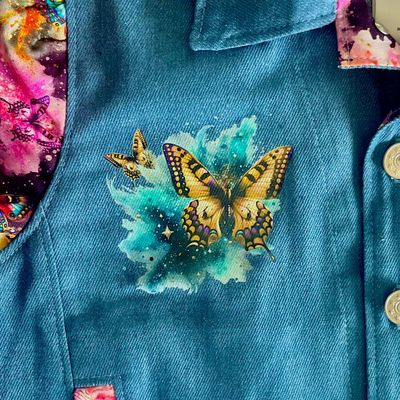 Beautiful lightweight cotton in a colourful butterfly print with matching decals & silver Jean buttons to finish the look. Perfect as a light extra layer on those changeable days!
