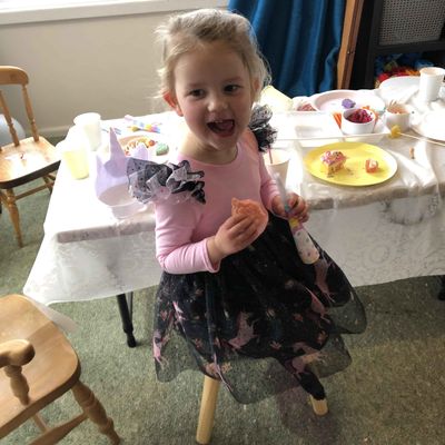 Cotton Jersey body with printed polyester tulle skirt and shoulder puffs