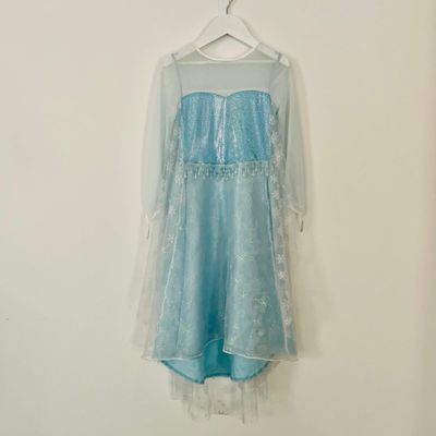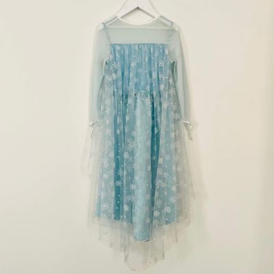 Holographic stretch body, mesh upper body and sleeves, glitter embellished organza skirt overlay, satin skirt lining, flocked tulle cape with crystal beading around waist and finger loops at the end of sleeves